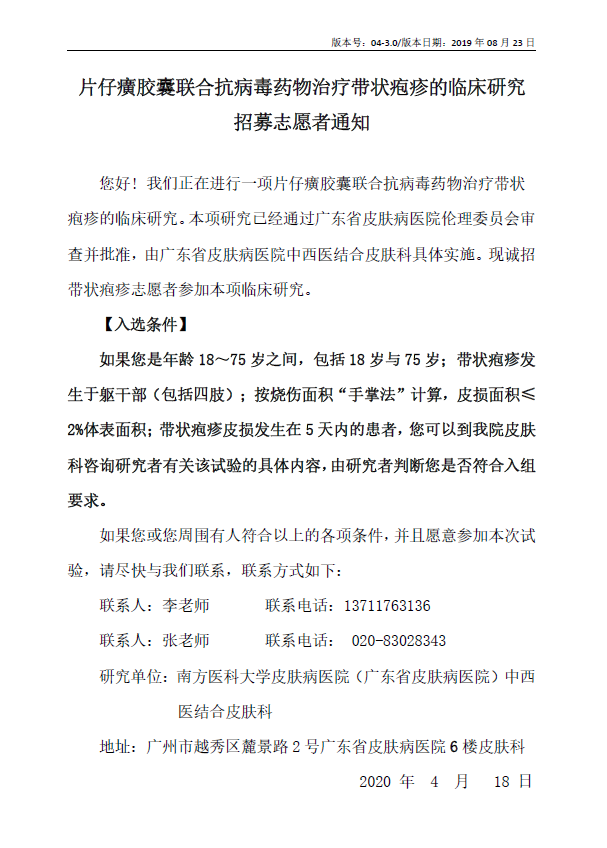 【已停止招募】带状疱疹患者招募,符合条件者有机会免费治疗