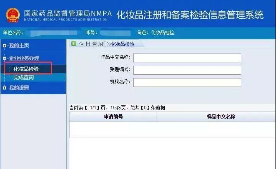 1企业用户登录后,进入主页面企业用户在该页面左侧的功能菜单选择【化妆品检验】点击页面【化妆品检验申请】按钮(温馨提醒:检验信息系统跟备案系统的账号密码一致)