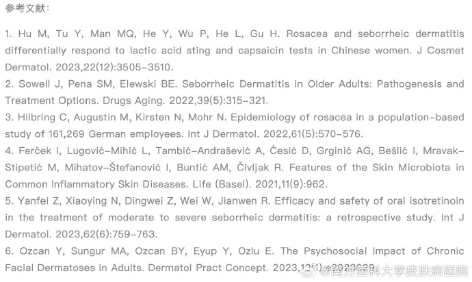 尽管脂溢性皮炎和玫瑰痤疮的皮损表现不同,但它们对患者生活质量的影响相似。这两种慢性面部皮肤病都会显著影响患者的情绪健康、社交互动和职业。值得注意的是,即使是轻度病例也可能造成显著的心理负担[6]。综合现有证据,脂溢性皮炎和玫瑰痤疮更像是"表亲"而非"亲兄弟"。它们共享着某些临床特征(如面部红斑)和病理机制(如皮肤屏障功能障碍、微生物群失衡和炎症),但在核心发病机制、典型表现和治疗策略上存在明显差异。从临床角度看,这两种疾病常共存或相互混淆,准确的诊断对选择适当治疗至关重要。对患者而言,理解这两种疾病的异同有助于更好地配合治疗和管理期望。尽管都是慢性疾病,但通过适当的医疗干预和生活方式调整,大多数患者能够获得良好的症状控制和生活质量。