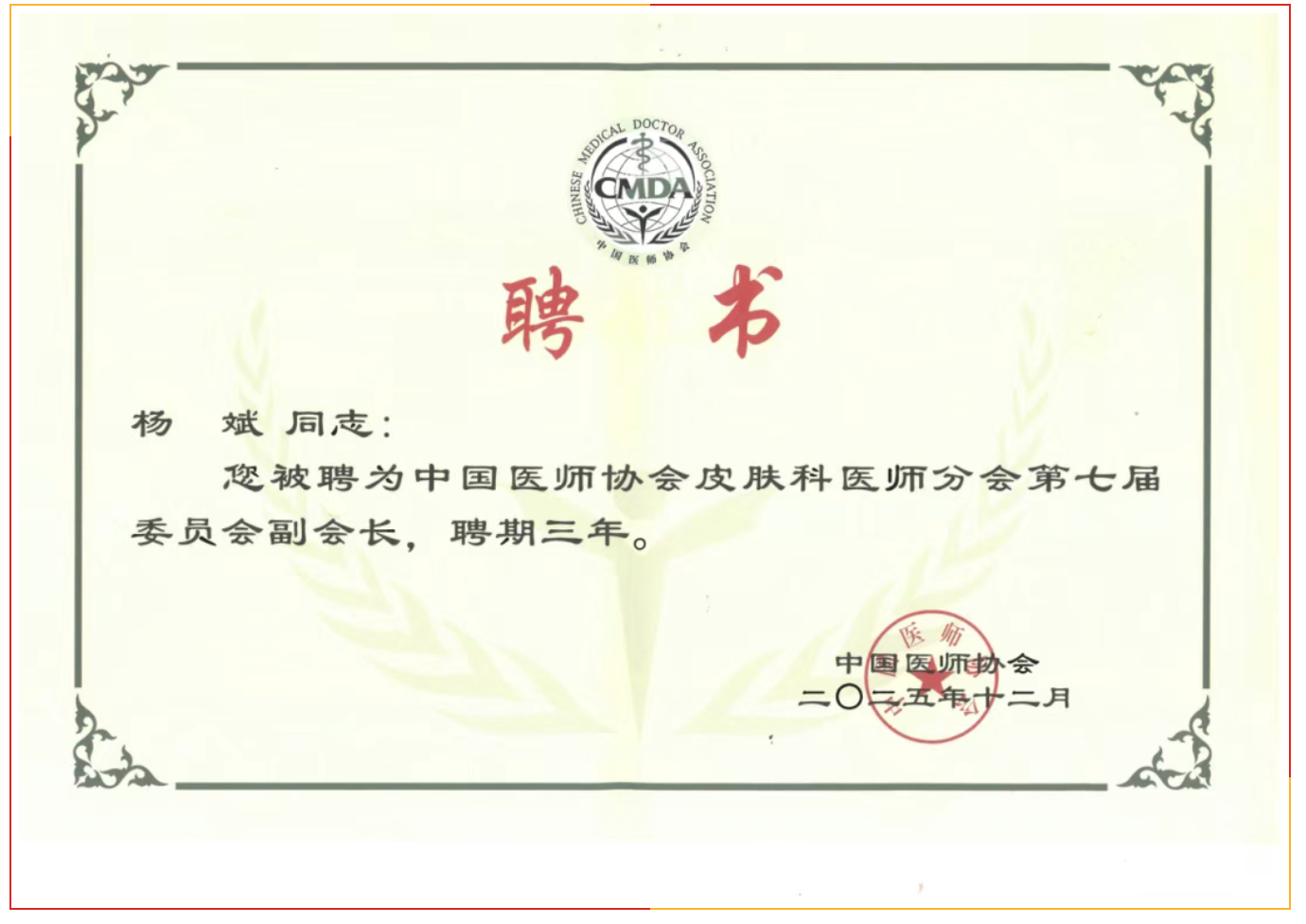 杨斌教授当选省医学会副会长、连任中国医师协会皮肤科医师分会副会长。