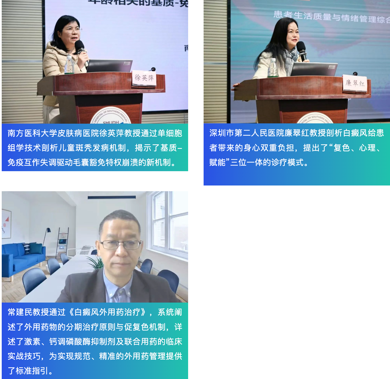 中国医师协会皮肤科医师分会会长、空军军医大学西京医院王刚教授在线上对大会的成功召开表示热烈祝贺,高度肯定了广东省白癜风专病联盟自2024年成立以来取得的积极成效,并指出联盟通过搭建多机构协作平台,持续开展“美丽告白·白癜风大讲堂”、多城市联动患者教育、基层义诊及多中心临床研究等系列工作,有效推动了白癜风规范化诊疗理念的传播与实践,期待联盟持续发挥平台引领作用,深化学术交流与临床转化,为全面提升我国白癜风诊疗水平、惠及更多患者作出更大贡献。