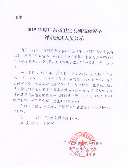 2015年度广东省卫生系列高级资格评审通过人员公示