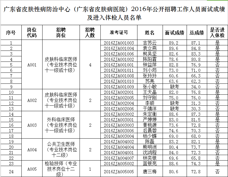广东省皮肤性病防治中心(广东省皮肤病医院)2016年公开招聘工作人员的面试工作已经结束。根据《广东省皮肤性病防治中心(广东省皮肤病医院)2016年公开招聘人员公告》要求,现将面试成绩、考试总成绩及进入体检人员名单公示如下:
