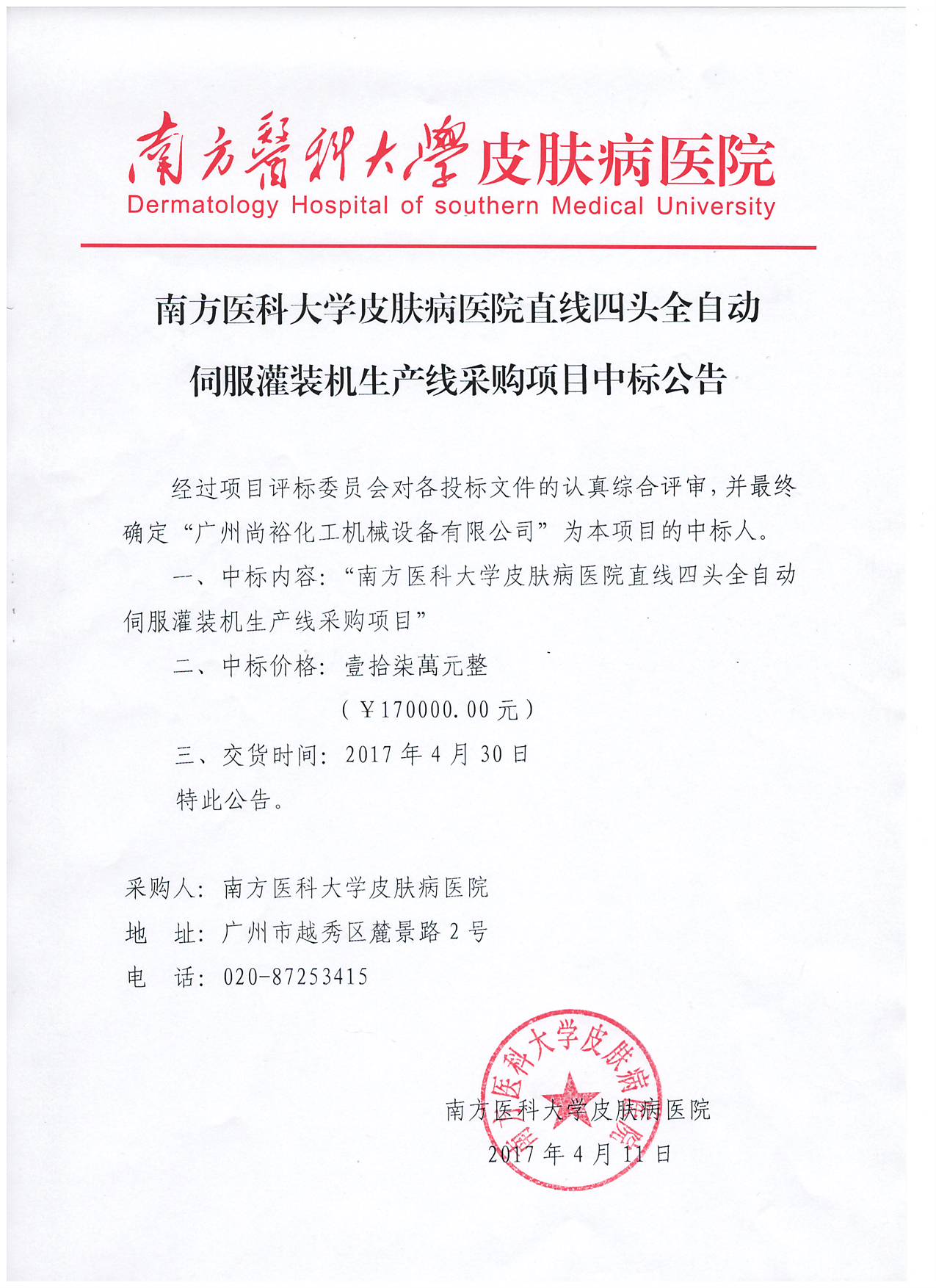 南方医科大学皮肤病医院直线四头全自动伺服灌装机生产线采购项目中标公告