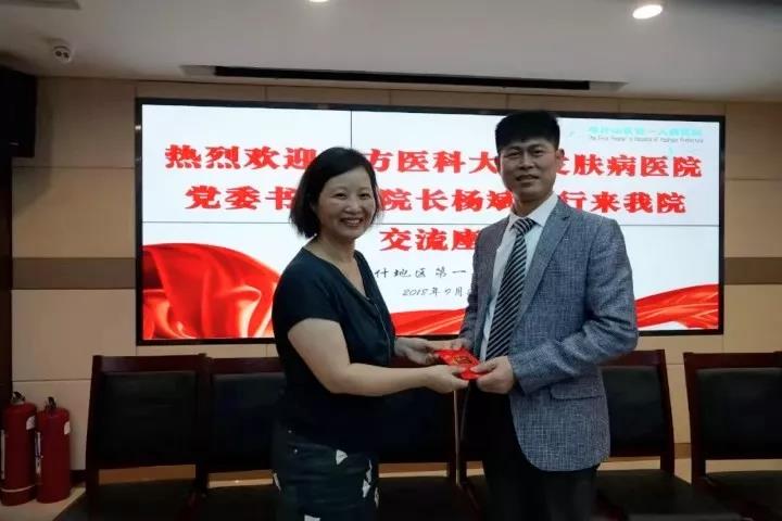 杨斌书记首先对喀什一院一直以来给我院援疆专家在工作上提供优质平台,在生活上无微不至的照顾表示感谢。她表示,喀什一院的“十三五”发展规划高瞻远瞩,南方医科大学皮肤病医院也很期待能够尽快参与到该院的“十三五”发展进程中,提供力所能及的支持与帮助。