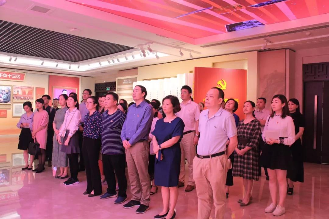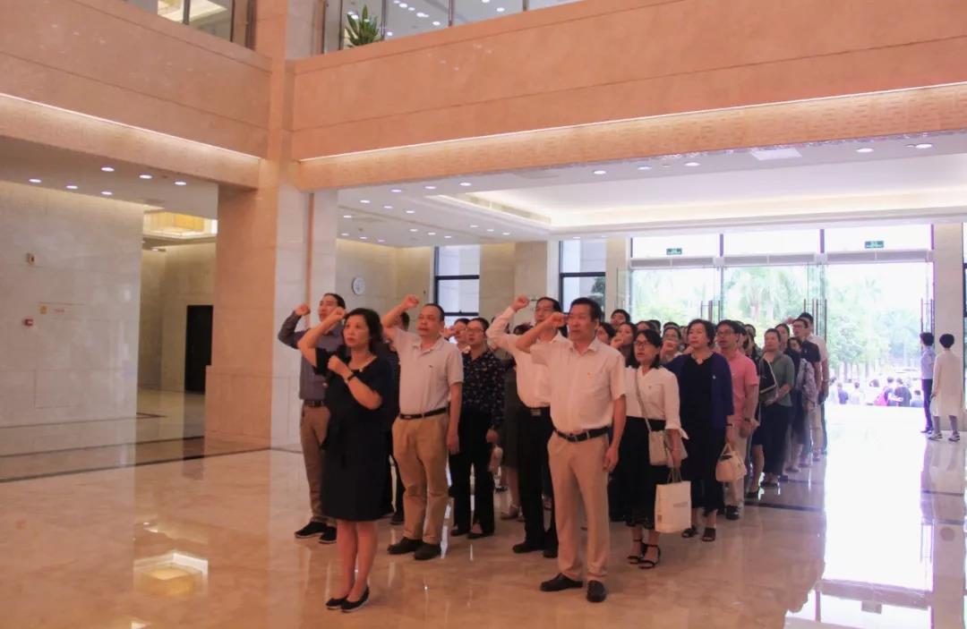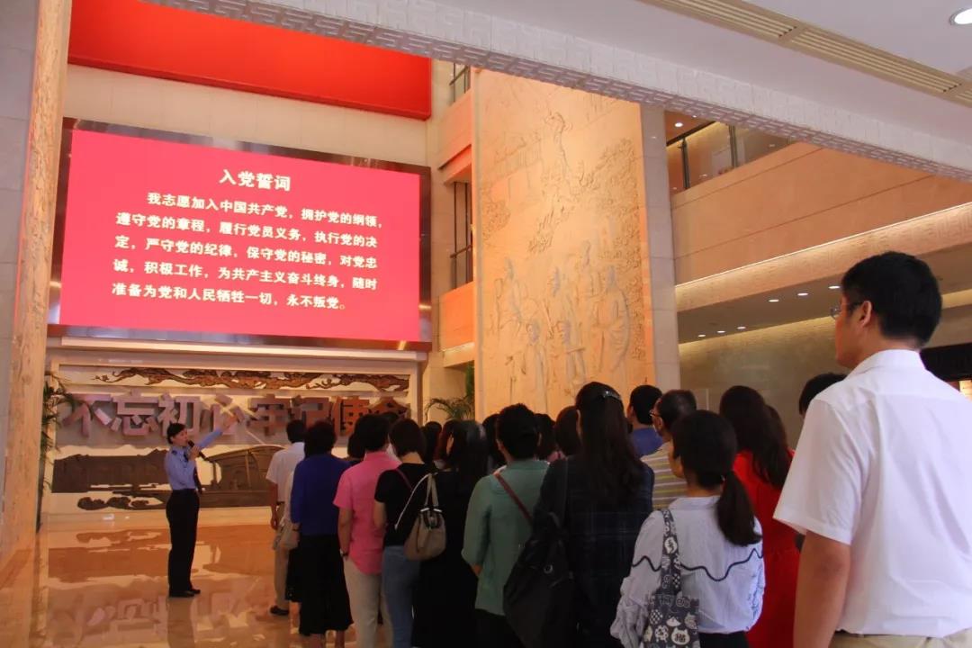 在教育基地的一楼大厅,面向鲜红的党旗,在杨斌书记的领誓下,全体成员庄严地举起右手,重温了入党誓言。