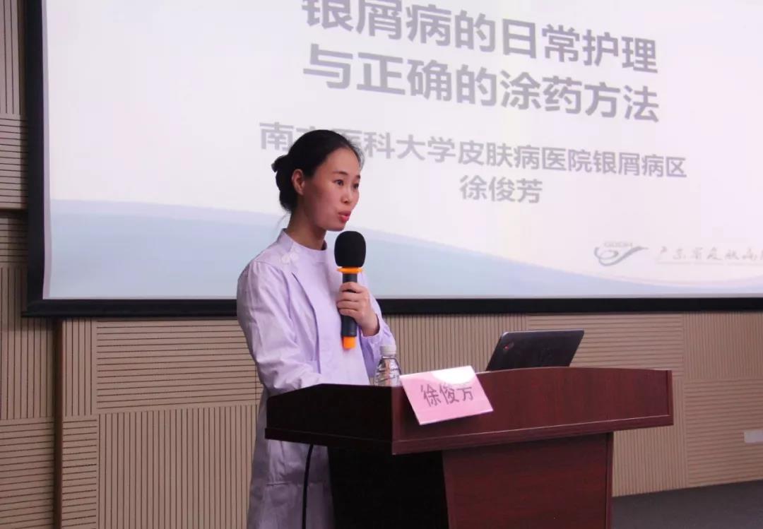 银屑病中心护士长徐俊芳讲述了《银屑病的日常护理与正确的涂药方法》,她从起居饮食、心理和皮肤护理等角度展开阐述,强调外用药物擦涂的“三字经”——先清洗、用手涂、勿太厚、轻按摩。