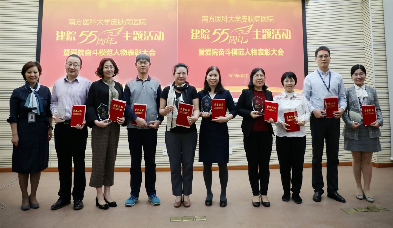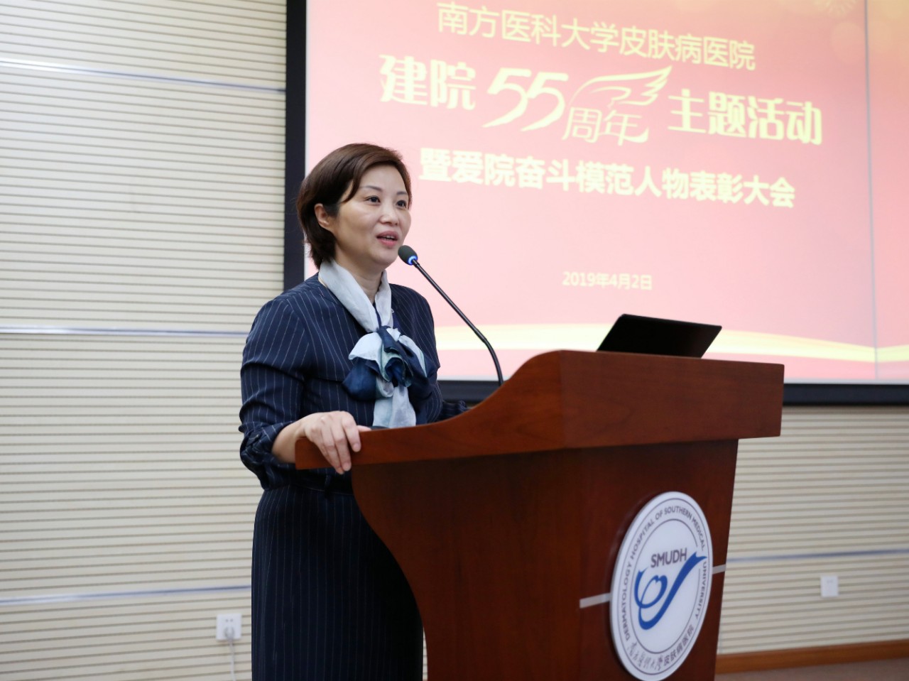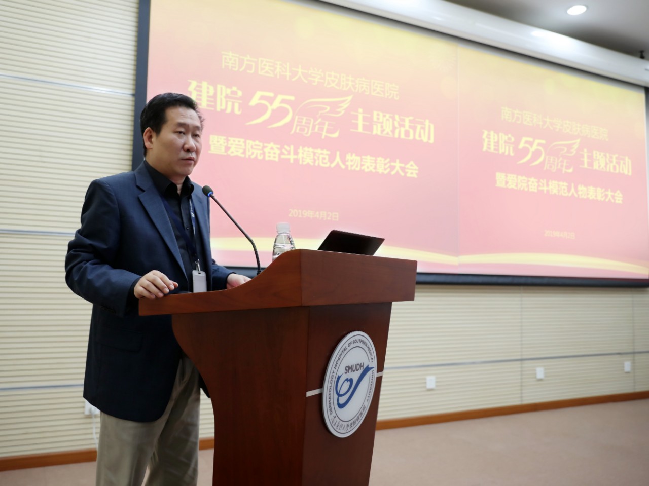 55载栉风沐雨,砥砺前行;55载春华秋实,满庭芬芳。4月2日下午,南方医科大学皮肤病医院在13楼学术报告厅举行庆祝建院55周年主题活动暨爱院奋斗模范表彰大会。医院领导班子、全体职工及部分医院老领导、老同志共300余人参加了会议。会议由院党委副书记、副院长郑道城主持。