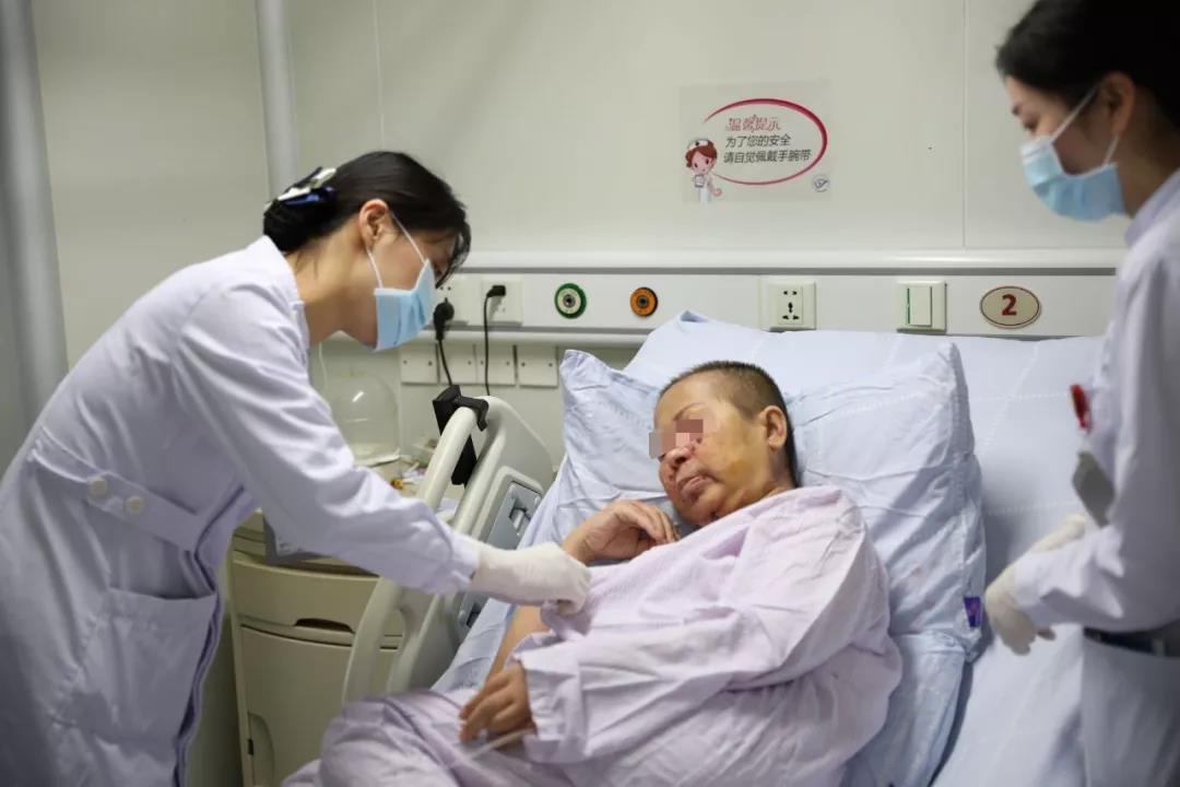 在我院,胡女士面部、前胸、后背大片的皮肤糜烂给每天为她换药护理的护士带来了挑战。大面积糜烂,意味着表皮没有了,只剩下血肉模糊。第一次给胡女士清洗换药,护士们忙得汗流浃背。那时,胡女士四肢浮肿,而她的血管很细非常难找,给抽血、打针造成了较大的困难。但护士们并没有被困难吓倒,而是创新护理手段,采用新型敷料,减少皮肤与药纱的黏连,延长换药时间,极大地减轻了胡女士的痛苦。而医生护士每天的鼓励和疏导,给这位高学历患者带来了极大的慰藉,抚平了她身心遭受的伤痛。