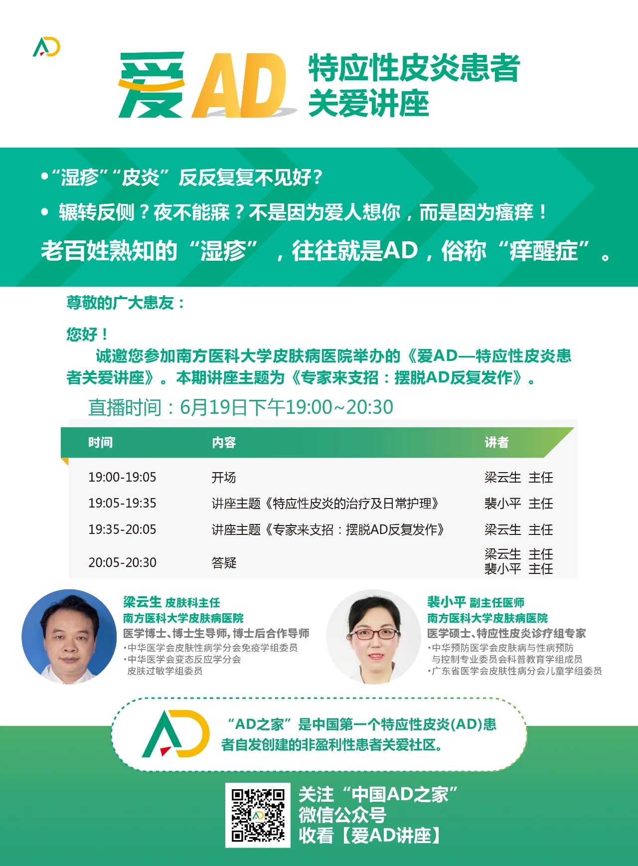 为普及特应性皮炎的预防和日常护理知识,回馈广大患者,南方医科大学皮肤病医院将于2020年6月19日19:00-20:30在“中国AD之家”微信公众号举办特应性皮炎健康知识讲座,届时将由我院皮肤科梁云生主任和裴小平副主任医师主讲,并为广大观众在线答疑,欢迎各位患友观看提问。