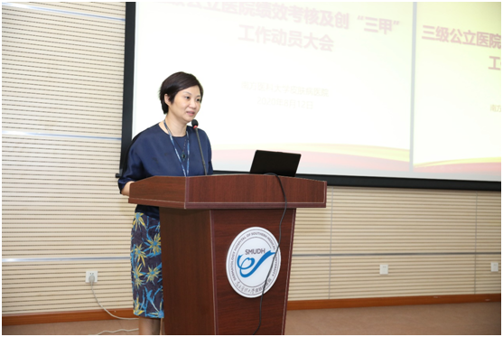 杨斌院长作了题为《坚定信心、迎难而上,打响绩效考核提升及创“三甲”攻坚战》的动员讲话。她强调,绩效考核与“创三甲”是医院搬迁以来遇到的最大挑战,院党委高度重视,将此项工作列为“一把手工程”,成立绩效办,与三甲办合署办公,加强联动落实。要打赢这场攻坚战,我们必须认真研读指标,吃透内涵,针对问题补齐短板;其次是全员动员,全员参与,层层落实责任。相信在省卫健委和大学党委的正确领导下与大力支持下,通过全院职工的艰苦奋斗和开拓创新,我们一定可以取得绩效考核与创三甲工作的优异成绩,推动医院高质量发展,落实现代医院管理制度,提升管理精细化水平,为人民群众提供优质医疗服务。