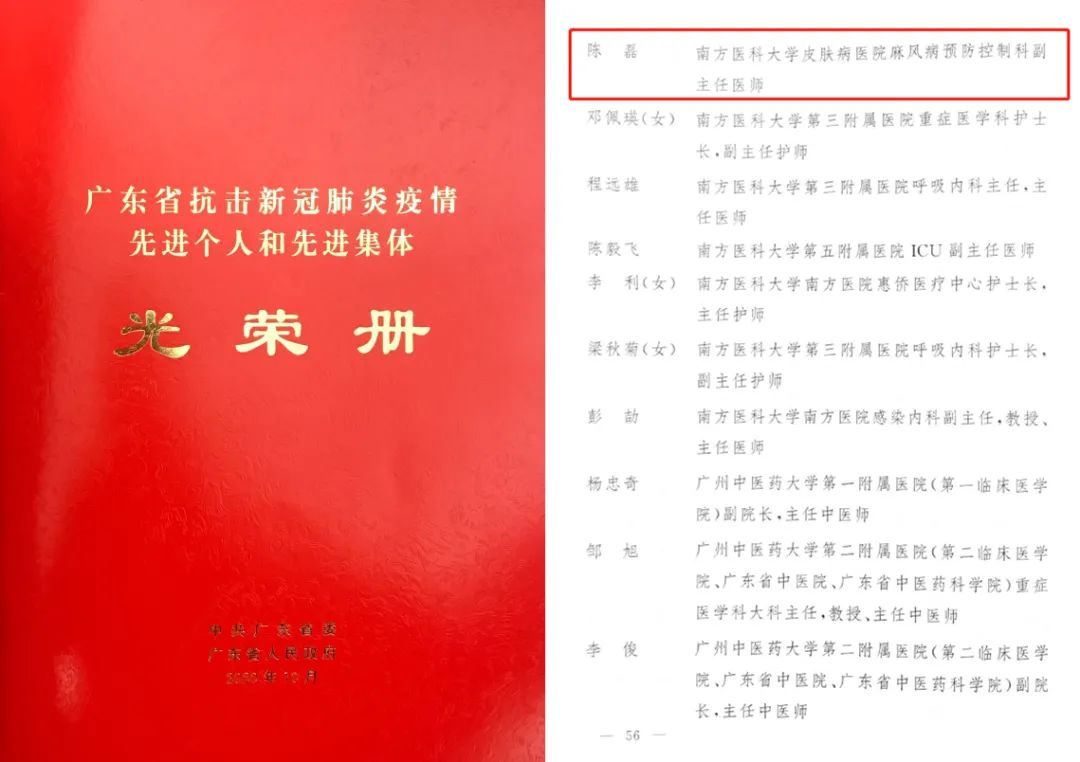 为表彰在抗击新冠肺炎疫情斗争中涌现出的先进代表,大力弘扬伟大抗疫精神,10月21日,全省抗击新冠肺炎疫情表彰大会在广州举行,会议以省委、省政府名义公布并表彰我省为抗击新冠肺炎疫情作出突出贡献的先进个人和先进集体。南方医科大学皮肤病医院陈磊同志获“广东省抗击新冠肺炎疫情先进个人”荣誉称号。