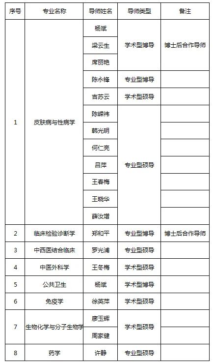 我院目前开设有皮肤病与性病学、临床检验诊断学、公共卫生与预防医学等多个专业的博硕士培养点,现有博导5名,硕导19名,博导博士后合作导师4名,具体如下: