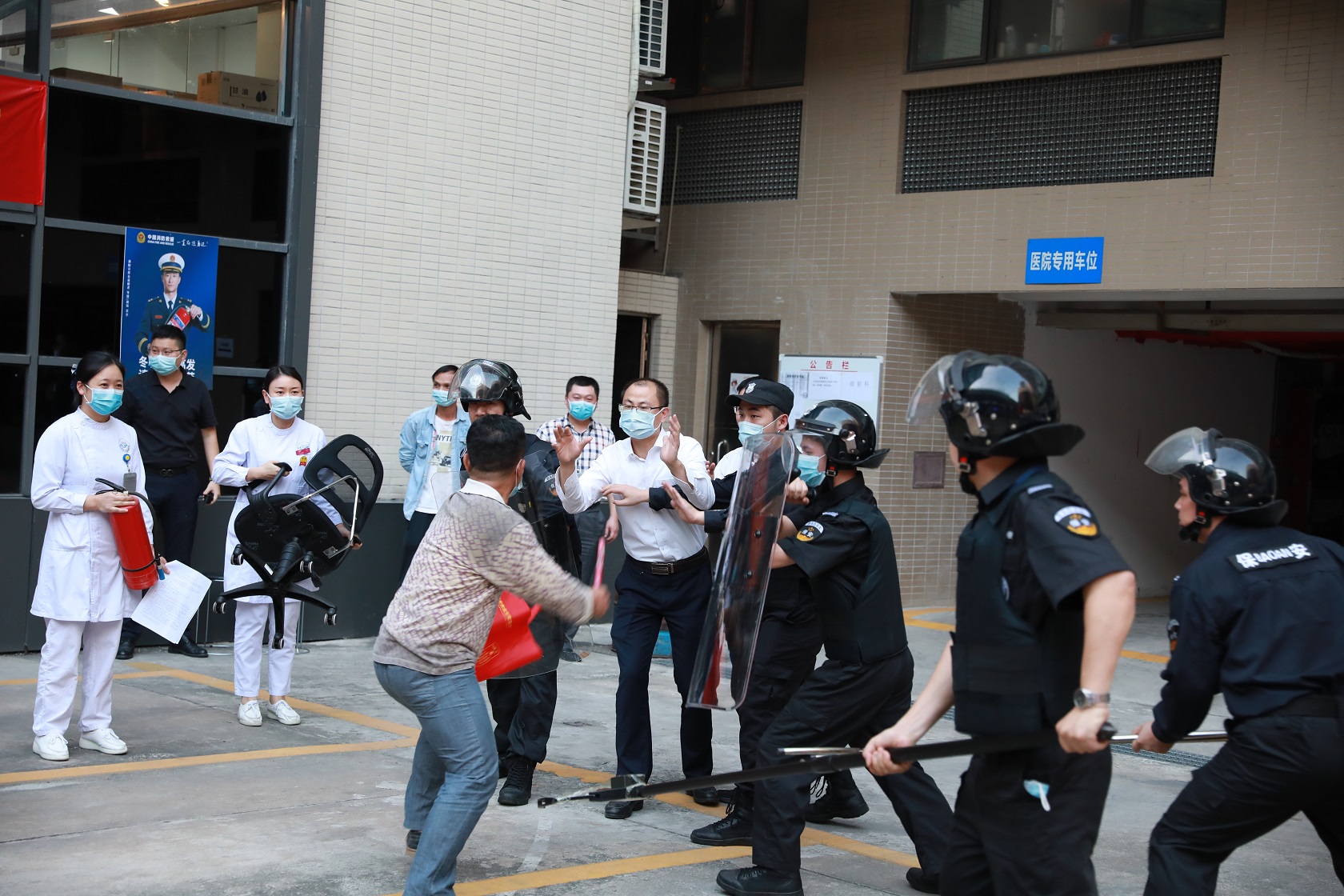 活动由总务科黄澍杰科长主持,郑道城副院长宣布演练开始。首先进行消防演练,以同步教学指导的方式进行,在发生火情后,病区护士迅速反应及时按响消防警铃,医院义务消防员在收到警报后迅速组织所有人员进行撤离,保安人员在收到警报后,分三个梯队迅速到场,以不同的等级展开灭火行动。随后进行了防暴演练,以导诊护士受到肇事者(保安扮演)暴力威胁开始,导诊人员在与肇事者沟通劝解的过程中能及时按报警按钮,并利用身边物品开展自我保护,保安人员收到警报后迅速带齐防暴工具到场,将肇事者制服。演练后,恒福消防支队张俊才队长以及登峰派出所谢运生警官,分别对演练过程进行精彩点评,并指出不足之处,消防队员还现场演示了各类消防器具的正确使用方法。最后,陈旭坚书记发表讲话,对本次活动成功举办表示祝贺,对演练效果给予充分肯定,对各位嘉宾的亲临指导表示感谢,他指出,医疗安全和消防安保工作是医院的安全生命线,要高度重视,常抓不懈,不断提高职工的安全意识,通过演习提高应急能力,不断提高我院的安全防护能力。郑道城副院长宣布演练结束,活动取得圆满成功。
