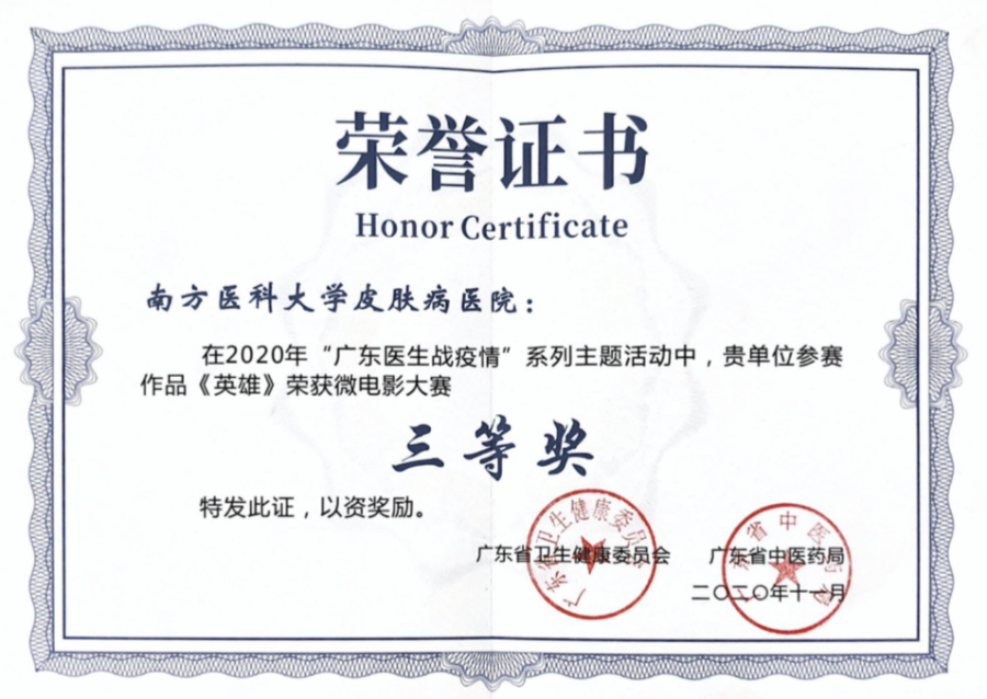 据悉,本次“广东医生战疫情”系列主题活动,得到了全省卫生健康系统的积极响应,共征集有“广东好医生”候选人94人,微电影作品57部、微视频作品119部,演讲参赛视频88个,摄影作品2007组(幅)、照片总数3900张。会上对第四届“广东好医生”、微电影大赛、演讲比赛、摄影大赛获奖者进行了颁奖。南方医科大学皮肤病医院2项参赛作品获得了荣誉。