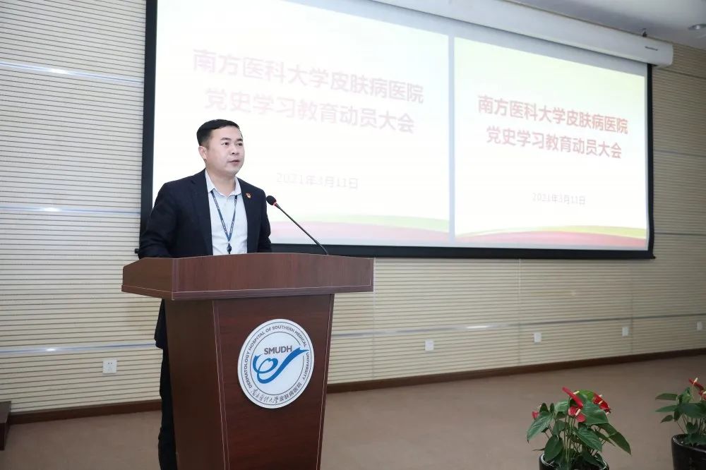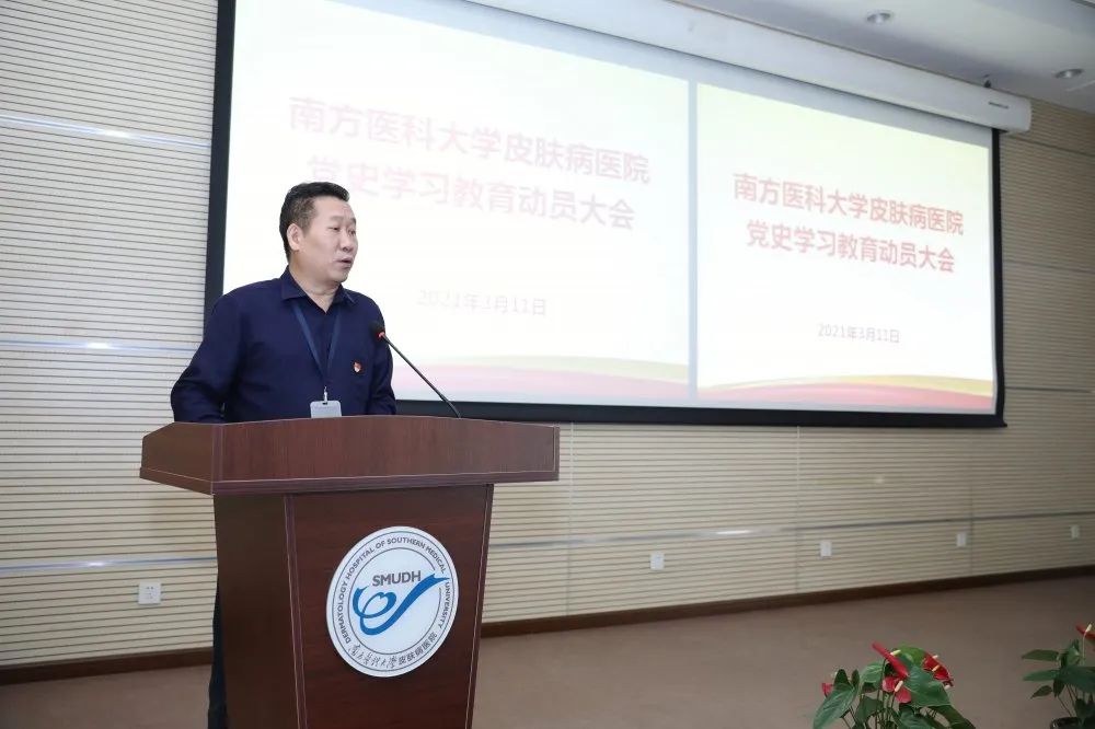 3月11日下午,南方医科大学皮肤病医院召开党史学习教育动员大会,深入学习习近平新时代中国特色社会主义思想,认真贯彻落实中央、省委、全市教育系统和学校党史学习教育动员大会精神及工作安排,对开展医院党史学习教育进行动员部署。医院党委班子成员、支部书记、全体党员参加会议,郑道城副书记主持大会。