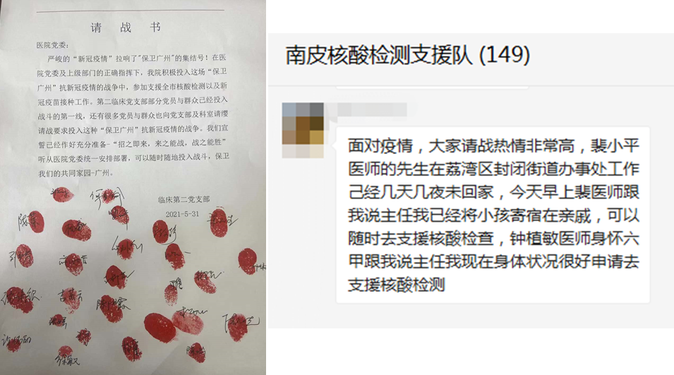 通知下发后,院党委接连收到各党支部、科室、农工民主党和台盟等民主党派医护人员的请战书,请战的人员中有的刚值完班,有的在休假中,还有的身怀六甲,请战书上的一个个签名和红手印,体现的是全体医务工作者的担当与情怀。
