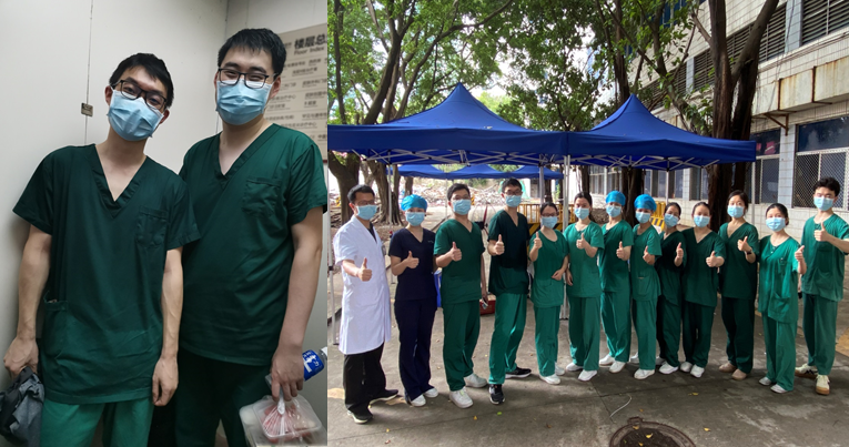 五月的广州,烈日与暴雨交替出现,我院核酸检测人员穿着密不透风的全套防护服、带着N95口罩和面屏,在临时搭建的帐篷里耐心地进行着标本采集,从白天到夜晚,从酷热到暴雨,衣服湿了又干、干了又湿,就这样牢牢坚守在岗位上,风雨无阻。
