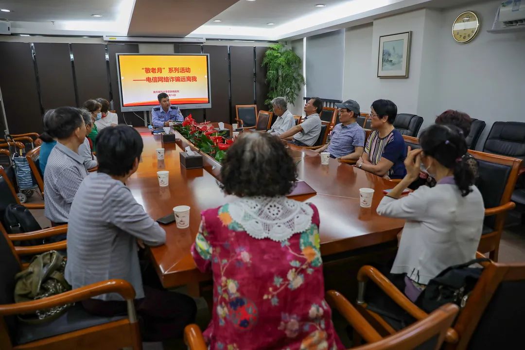 为深入贯彻落实习近平总书记关于老龄工作重要指示精神,响应南方医科大学关于开展2021年“敬老月”活动有关要求,弘扬中华民族敬老爱老传统美德,正值重阳节之际,10月14日,南方医科大学皮肤病医院开展“敬老月”系列活动,我院部分领导班子及有关科室、退休职工欢聚一堂,为退休职工送上节日的问候与祝福。为提高退休职工防范电信网络诈骗的意识和能力,我院结合“我为群众办实事”实践活动,邀请登峰街道派出所杨警官为退休职工开展老年人电信网络反诈骗的法治宣传讲座。