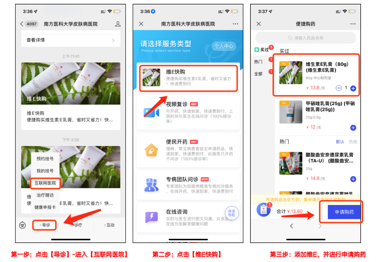 南方医科大学皮肤病医院贯彻落实“以人民为中心”的发展理念,持续优化便民服务,结合近期冬季皮肤干痒、泛红、脱屑的患者增多的情况,我院开设了冬季皮炎门诊,设置“维生素E乳膏快速购买”线上、线下便捷通道,将有专业医护人员为您提供认真、及时的服务。线上:便捷购买指引