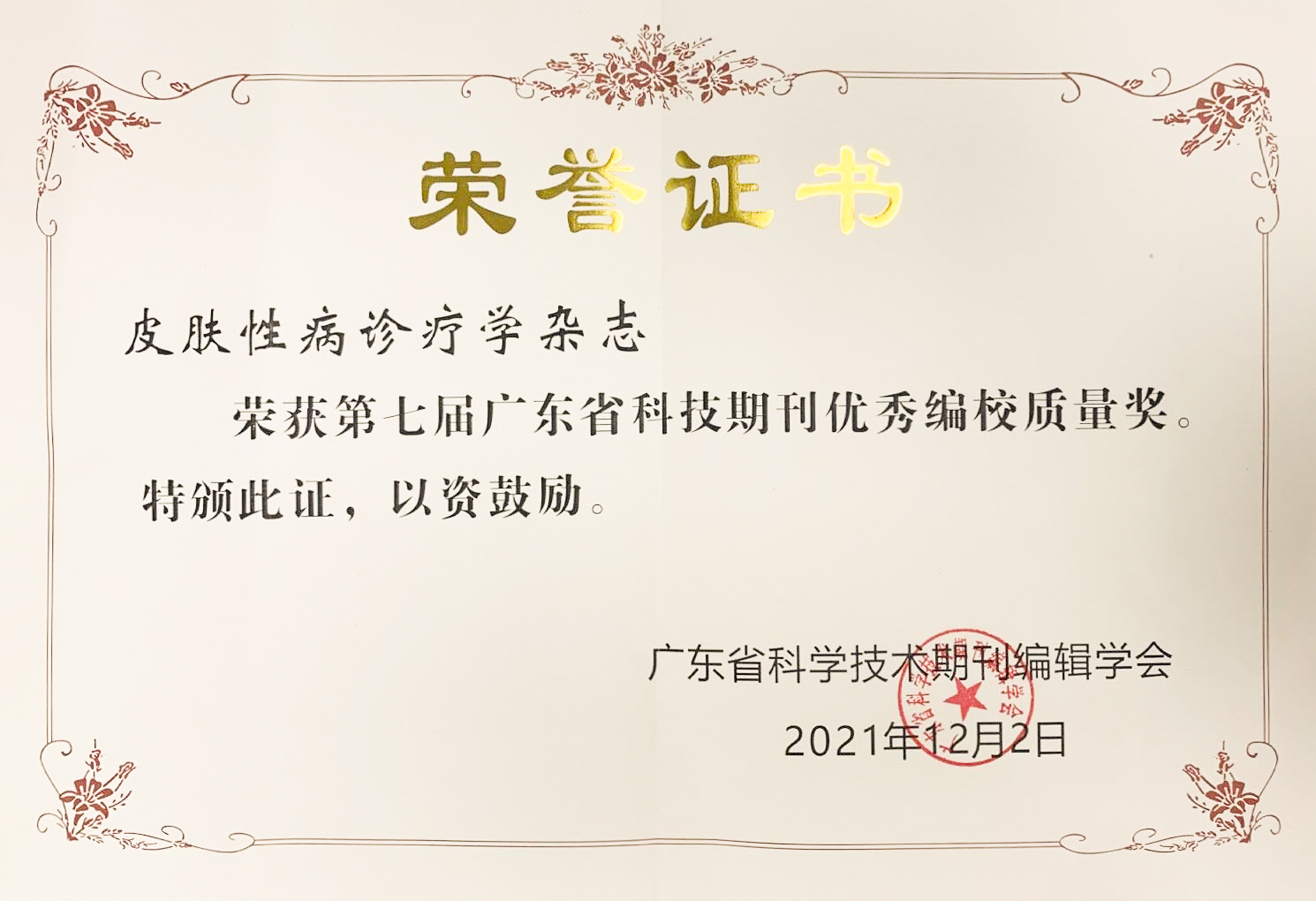 由我院主办的《皮肤性病诊疗学杂志》荣获 “广东省科技期刊优秀编校质量奖”荣誉称号。该奖项是广东省科技期刊编辑学会为深入贯彻落实《中共中央宣传部