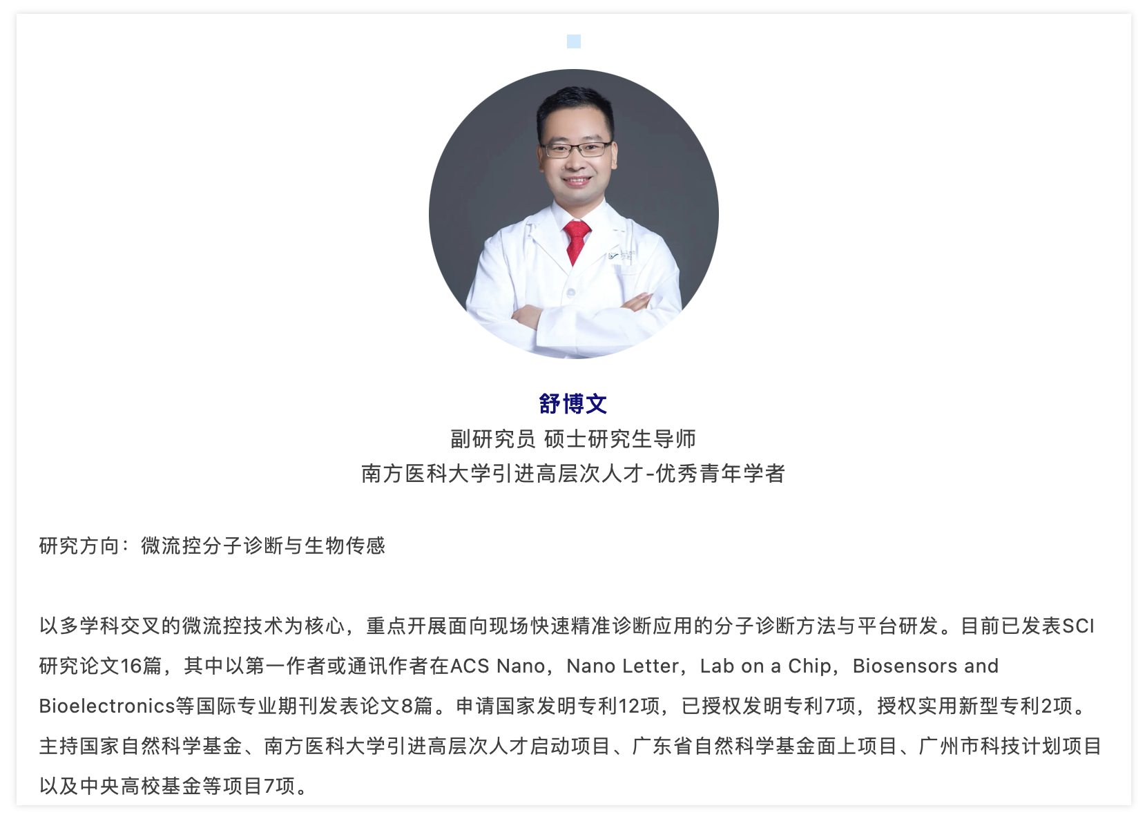 Bioelectronics等国际高水平杂志上发表多篇论文,获得多项发明专利,主持国家重点研发计划1项,国家自然科学基金6项、省部级科研项目10余项、省级人才项目1项等。