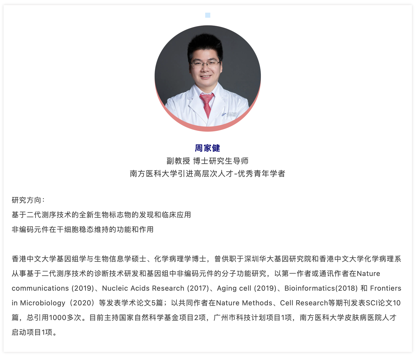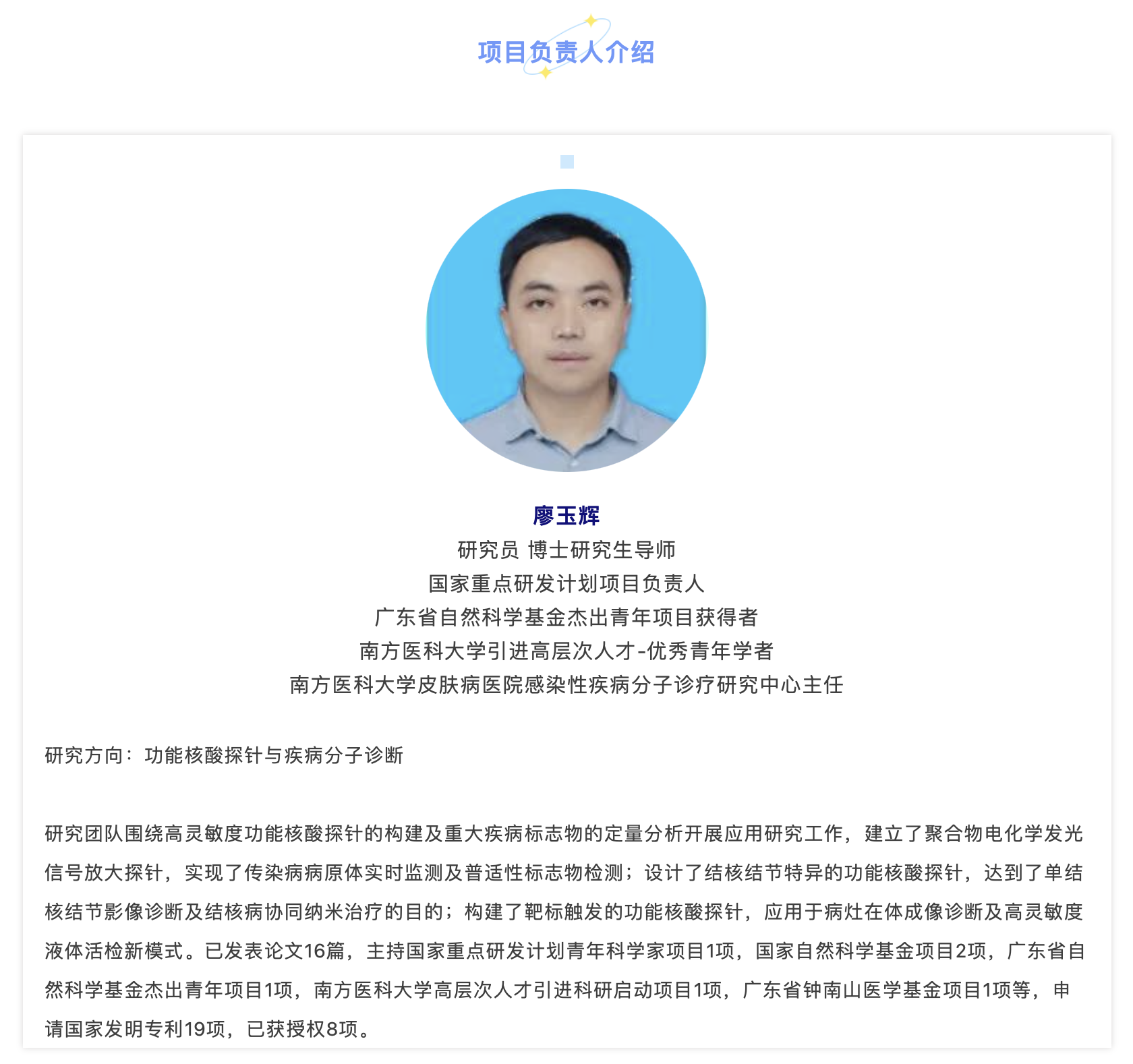 围绕感染性疾病快速精准诊疗与防控方面的国家重大战略需求,南方医科大学皮肤病医院创建了感染性疾病分子诊疗技术研究中心,该中心以廖玉辉、舒博文和周家健为学科带头人,并组建具备临床医学、材料化学、生物物理学、生物信息学、公共卫生防控等多学科背景的博士后、青年科研人员创新研究团队。