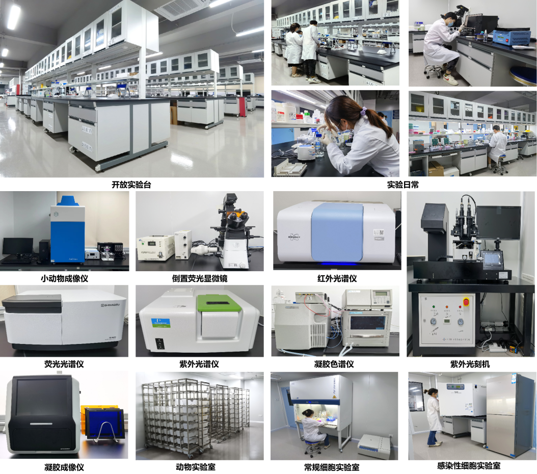 中心具备完善的临床与科研条件,实验场地占地面积700余平方米,包括常规细胞实验室、感染性细胞实验室、动物实验室、动物操作间、斑马鱼实验室、精密仪器室、芯片实验室、微纳加工实验室、会议室等功能区,配置了小动物活体光学成像系统、倒置荧光显微镜、紫外光刻机、荧光分光光度计、紫外分光光度计、红外光谱仪、凝胶成像仪、凝胶色谱仪、荧光定量PCR仪、纳米孔测序仪等精密设备,可开展从分子水平、细胞水平、组织水平到动物水平的分子诊疗研究。