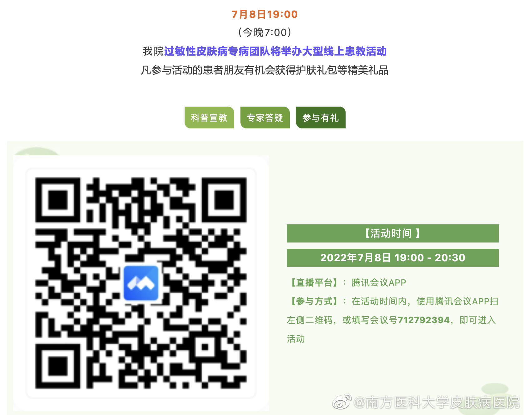 我院过敏性皮肤病专病团队将举办大型线上患教活动