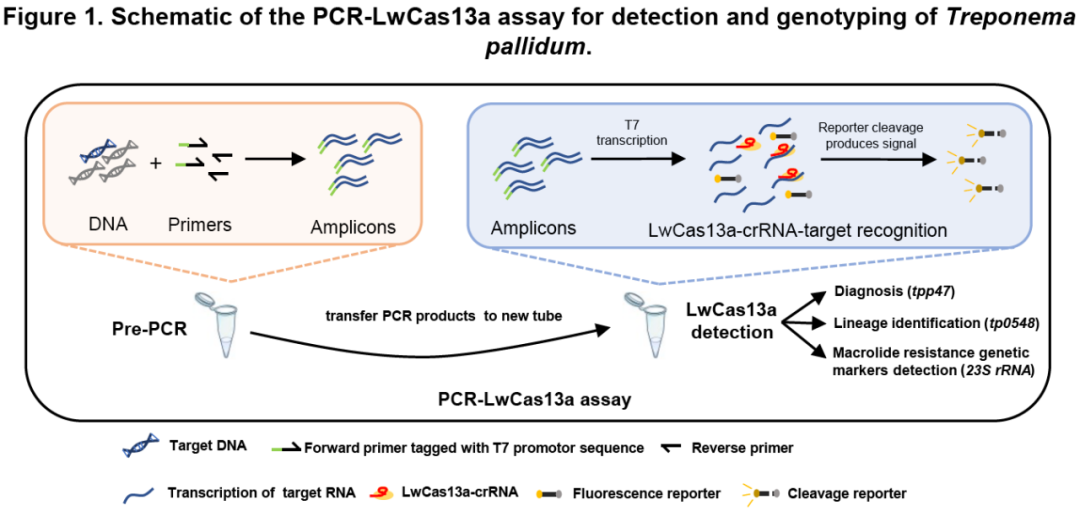 该研究开发了一种将PCR和CRISPR-LwCas13a结合的梅毒螺旋体的检测方法,该方法与传统Realtime