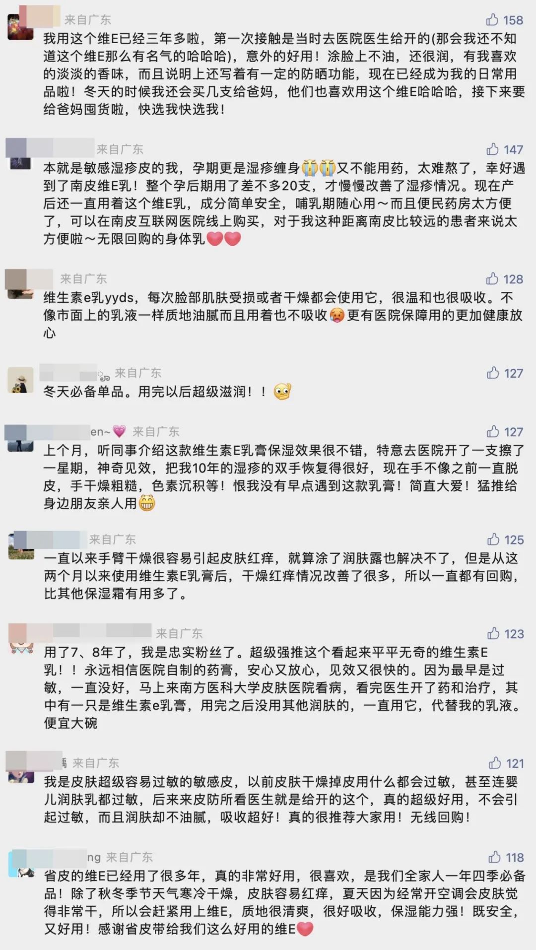日前,我院“回馈时刻”活动上线后,许多读者在后台留下了,使用南皮维E的真情实感的评论 在此推荐的维生素E乳膏是我院自制润肤乳,会在成分上做“减法”,它的主要成分为维生素E、甘油等,都是最基础的保湿成分。和市面上一些保湿产品相比,医院自制润肤乳对敏感皮肤更“友好”,不容易引起过敏,又能满足日常保湿需求。每年这个季节,很多患者来看病,因为入秋之后空气干燥,使得皮肤容易丢失水分,脱屑、瘙痒。对于这类患者,治疗以保湿、修复皮肤屏障为主,医生通常也会开维生素E乳膏。因其成分简单、刺激小,对老人、小孩子也很友好,能缓解不适。不少家属给老人、孩子使用后,都会给推荐给其他人。涂得不够厚,保湿效果会受影响。秋季身体保湿,几天就会用完一支,市面在售多数品牌润肤乳动辄几百上千,这涂的不是润肤乳,是钱啊!而我院自制的维E乳膏,一瓶80克,仅13.8元!!!比市面上中低端护肤乳都便宜,却享受药品级的皮肤护理,用起来自然性价比“爆表”,完全不用担心费钱。维生素E乳膏质地略微厚重,为乳白色膏体,涂抹后很容易推开,吸收也很快,不粘腻、不油腻,并且有一点淡淡的清香,闻着很舒服。经测试,涂抹乳膏后,涂抹区域含水量大幅增加,即时补水、保湿的功效很不错,而且保湿时间较长。在使用维生素E乳膏后的不同时段,我们用皮肤水分测试仪对保湿效果进行了测试效果如下(测试部位:右脸颊):从测试结果来看,涂抹后,脸颊的含水量大幅增加,即时补水、保湿的功效很不错,而且保湿时间较长。拥有维E乳膏的“绿色通道”每逢秋冬换季,我院维生素E乳膏的需求量大大增加,为了方便广大患者群众,我院已开设“维生素E乳膏快速开方(处方)”线上、线下绿色通道,随时满足各地群众的护肤需求.南方医科大学皮肤病医院(广州市越秀区麓景路2号)门诊楼二楼设有便民开药门诊,现场即可快速挂号、开处方、缴费、取药。2关注“南方医科大学皮肤病医院”官方微信公众号,按以下步骤开具处方如有疑问,可在医院官方公众号(南方医科大学皮肤病医院)后台留言咨询,小编会尽快回复您.