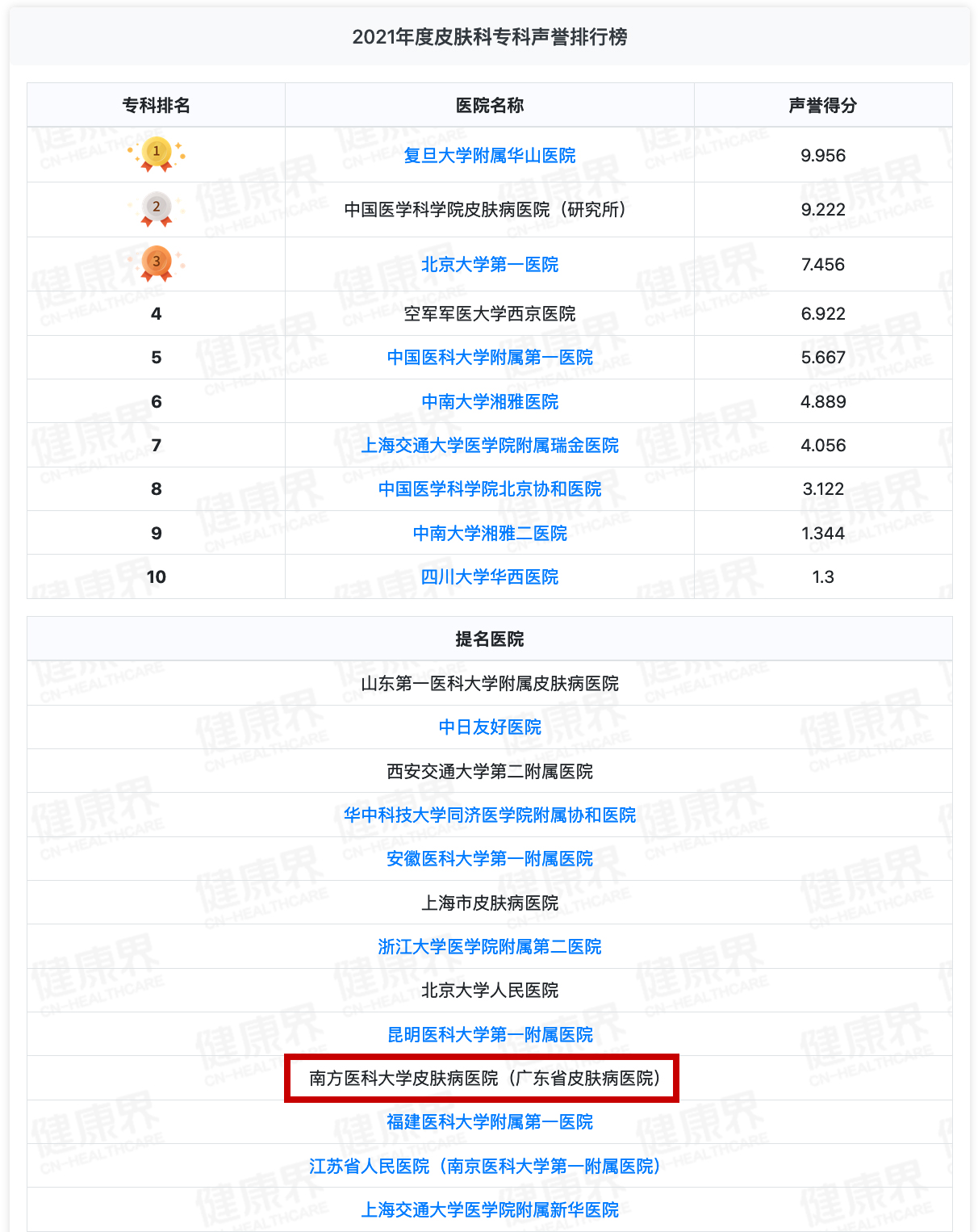 2022年11月20日,复旦版《2021年度中国医院专科声誉排行榜》在上海发布。我院成功获得全国2021年度皮肤科专科声誉排行榜提名,并荣获华南地区皮肤科专科声誉排行榜第一名。