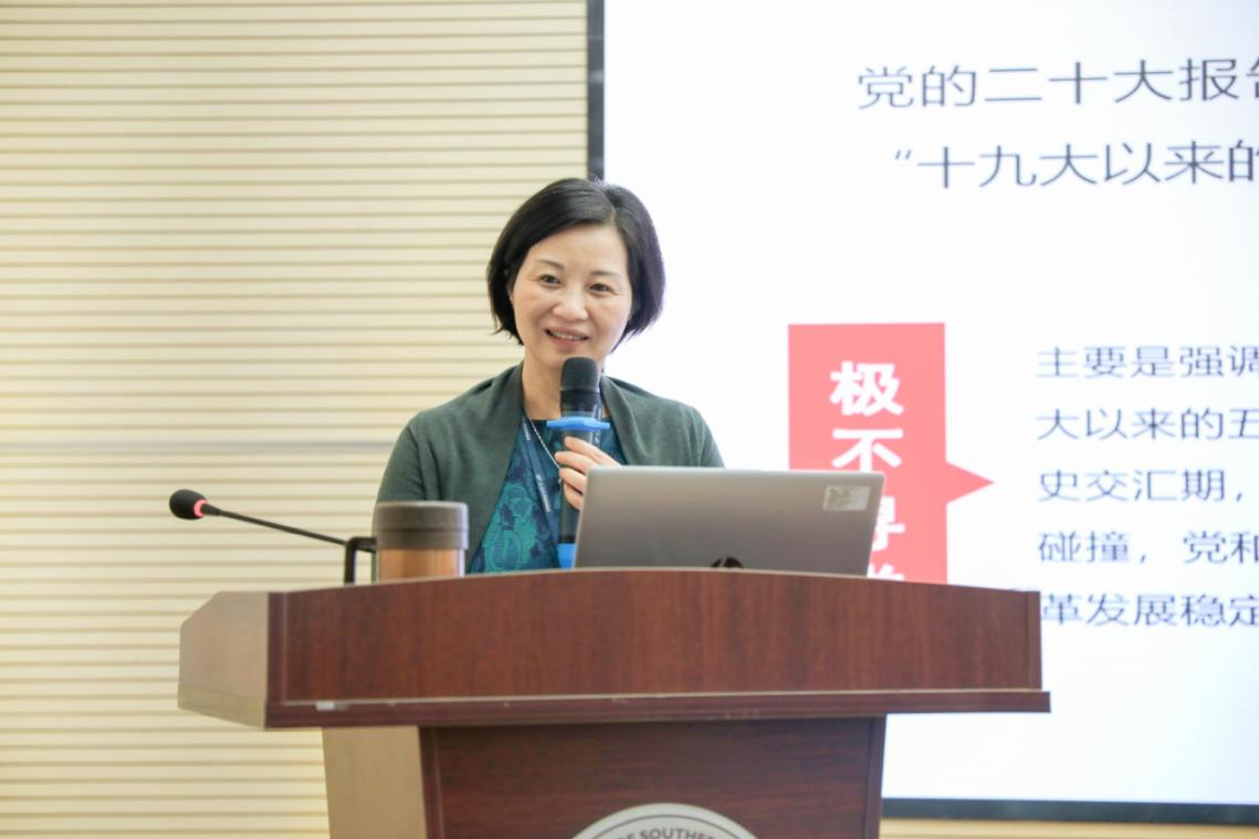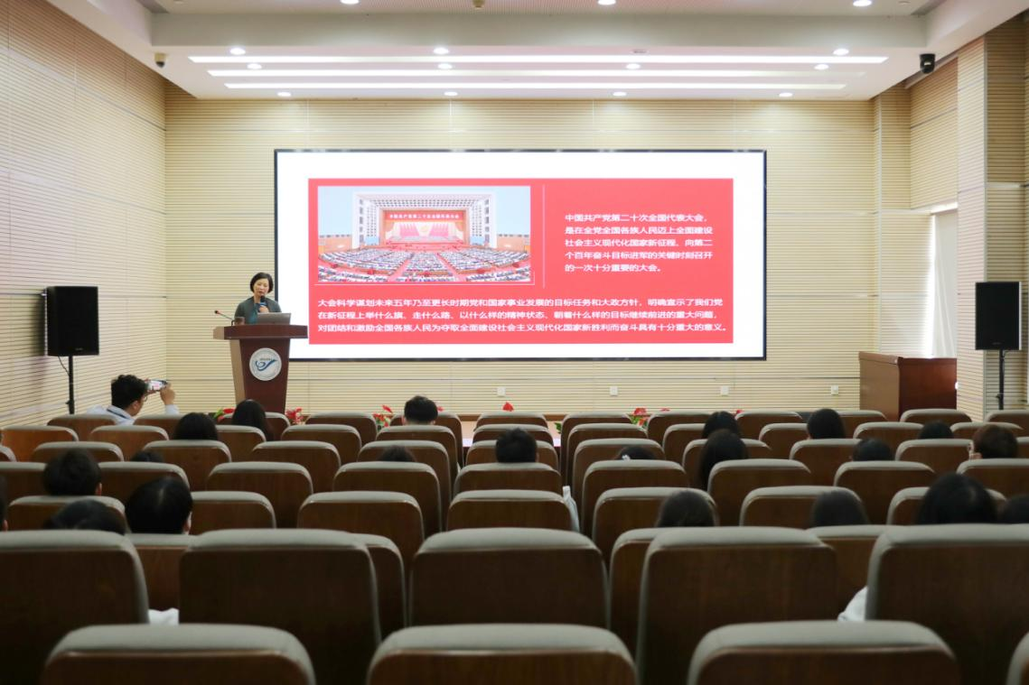 杨斌院长对党的二十大报告中过去五年的工作和新时代十年的伟大变革、开辟马克思主义中国化时代化新境界、新时代新征程中国共产党的使命任务、实施科教兴国战略,强化现代化建设人才支撑、坚定不移全面从严治党,深入推进新时代党的建设新的伟大工程、牢牢把握团结奋斗的时代要求等内容作了系统阐释和解读。她强调,作为新时代的研究生,应树立正确的三观和人生目标,要以有锲而不舍,持之以恒的精神,时刻坚持学习思考、探索创新。最后,杨斌院长以“青年强,则国家强”作为结语,勉励同学们要坚定不移听党话、跟党走,既怀抱梦想又脚踏实地,敢想敢为又善作善成,立志做有理想、敢担当、能吃苦、肯奋斗的新时代好青年。
