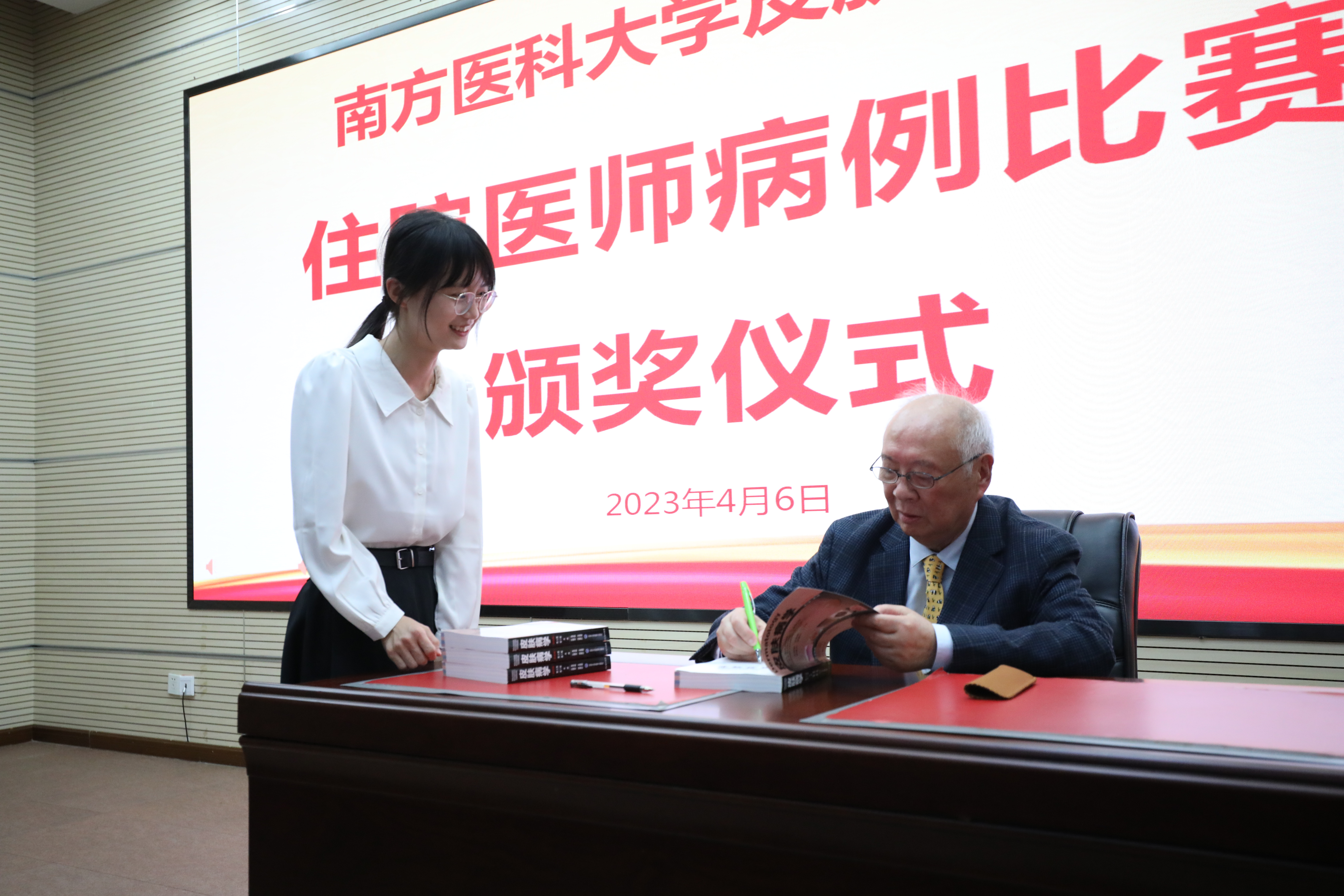 朱教授为获奖学生签名赠送他主译的教材《皮肤病学(Dermatology)》