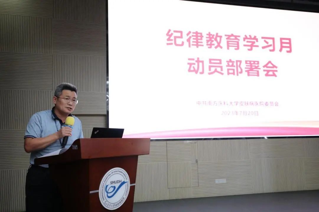 7月20日,南方医科大学皮肤病医院召开纪律教育学习月动员部署会。院领导班子、中层干部、党支部书记、纪检委员、组织专员等相关人员参加会议。会议由党委副书记郑道城主持。