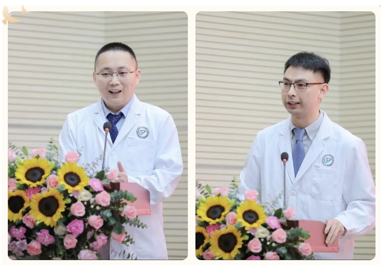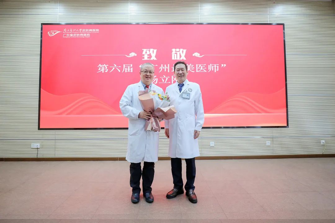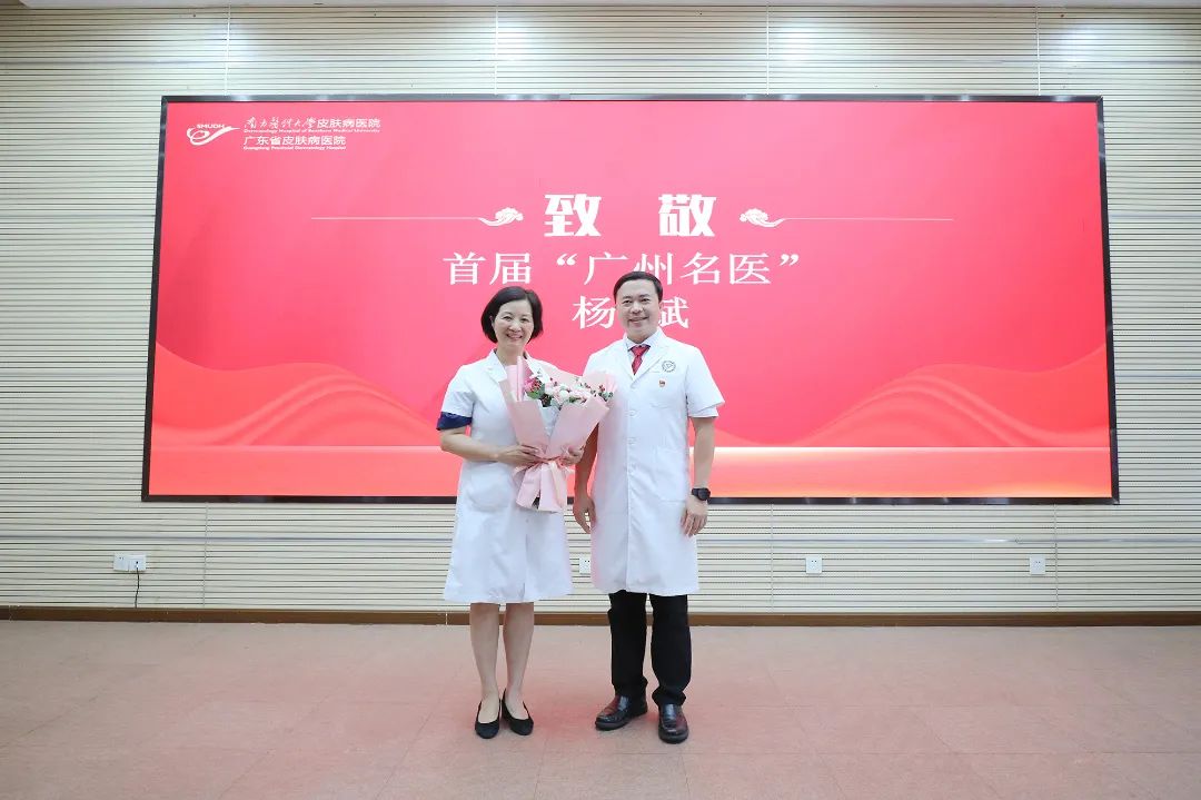 党委书记陈旭坚、党委副书记郑道城代表医院分别对荣获首届“广州名医”的杨斌院长和第六届“广州(首届省市联合)最美医师”的杨立刚主任进行致敬,学习他们精术济世、护佑生命大无畏精神。