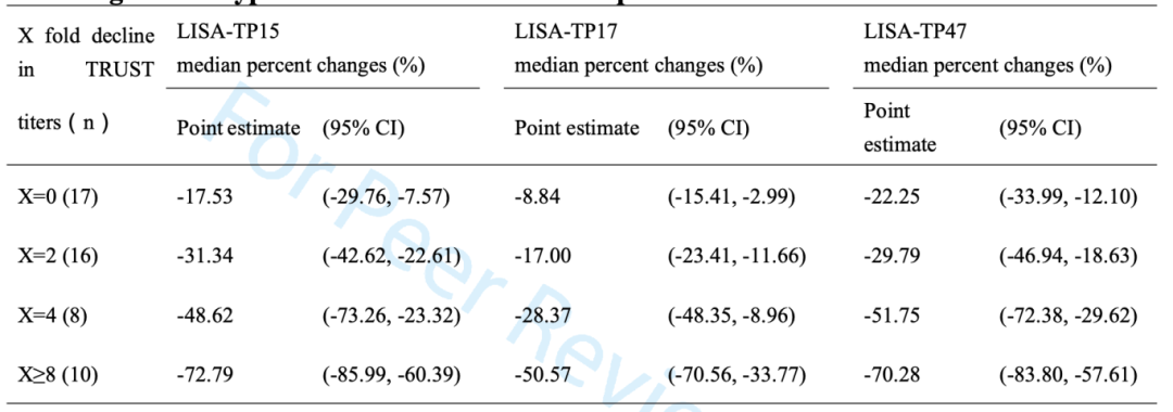 (RLU)存在显著差异。在梅毒配对血清样本中,治疗后LISA-TP15、TP17、TP47和NTTs滴度的RLU下降(P<0.001)。当NTTs滴度下降0、2、4或≥8倍时,LISA-TP15的RLU下降17.53%、31.34%、48.62%和72.79%;LISA-TP17