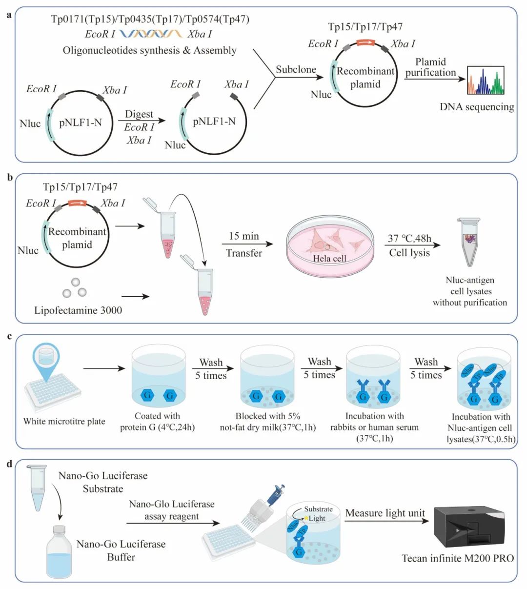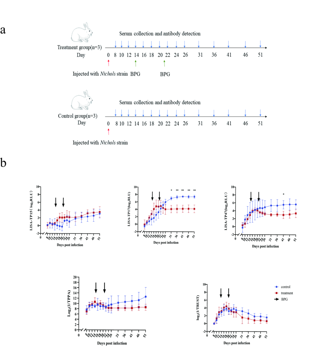 本研究团队研发用于检测梅毒TP15、TP17和TP47抗体的荧光素酶免疫吸附实验(LISA),使用临床梅毒血清样本用于评估梅毒诊断,并通过梅毒兔感染和治疗模型及临床配对血清来评估治疗效果。结果发现与TTs相比,LISA-TP15、TP17和TP47的敏感性分别为91.9%、96.9%和98.8%,特异性分别为99%、99%和98%,AUC分别为0.971、0.992和0.995。在梅毒兔模型的系列血清样本中,观察到LISA-TP17和LISA-TP47的治疗组与未治疗组之间的相对光单位