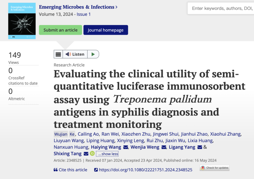 Infections(EMI)》在线发表文章,这是我院临床科研工作又一个重要成果。我院性病科团队基于梅毒螺旋体特异性抗原建立的半定量荧光素酶免疫吸附实验,不仅可用于梅毒的诊断,同时可用于梅毒的疗效评估,为梅毒患者提供新的诊疗方案。