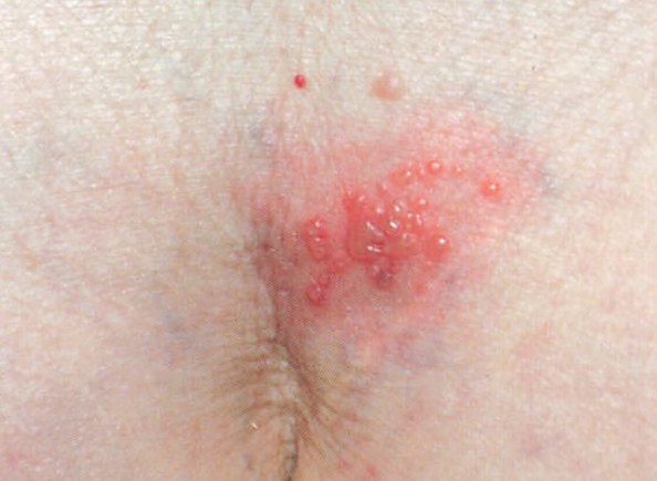 典型症状:1.生殖器及肛周区域水疱、溃疡;2.首次感染常伴发热、腹股沟淋巴结肿大。生殖器疱疹的复发频率通常高于单纯疱疹。